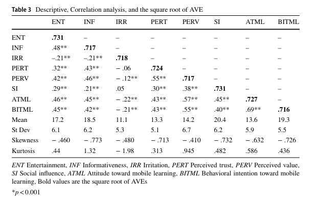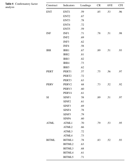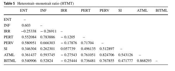 following Fornell and Larcker’s (1981) criteria. It is determined that a set of items measuring specifically their construct are not cross-loading on other constructs. Table 3 shows that the square root of Average Variance Extracted (AVE) values of ENT, INF, IRR, PERT, PERV, SI, ATML, and BITML are larger than the corresponding latent variables correlations. The establishment of discriminant validity is also confirmed by the values of HTMT (see Table 5). The HTMT method is a better