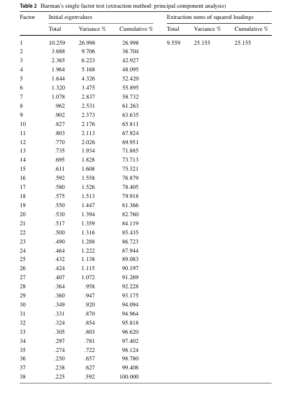 The common method bias (CMB) was calculated using Harman’s single factor test, which measures the variance that can be attributed to a single factor. All thirty eight items from the eight constructs were loaded into a factor analysis to determine whether a single factor emerges and accounts for the majority of the covariance among the measures. If no single factor emerges and accounts for the majority of the covariance, then it means that common method variance is not a prevalent issue in the study. The variance percentage after extraction is 25.155, which is less than 50%, (see Table 2) indicating that there is no CMB in the study (Tehseen et al., 2017). The values of the mean and standard deviation of the variables are within the acceptable range. Skewness and kurtosis values are also within the limits, thus showing the normality of the data as can be seen in Table 3. Furthermore, the Pear son correlation of the variables is shown in Table 3 which describes inter-correlation among the variables. All variables have a positive and significant impact on each other except irritation which has a negative and significant correlation with all vari ables of interest.