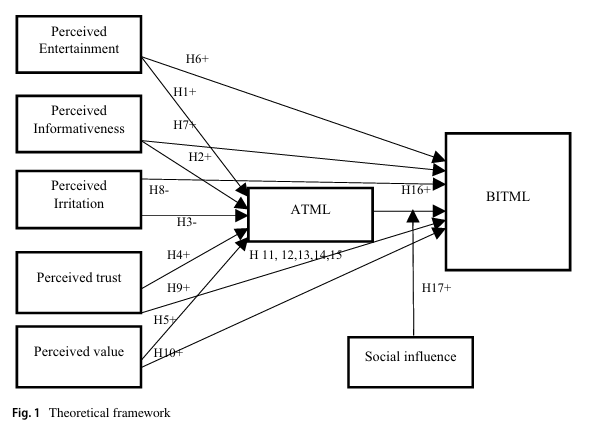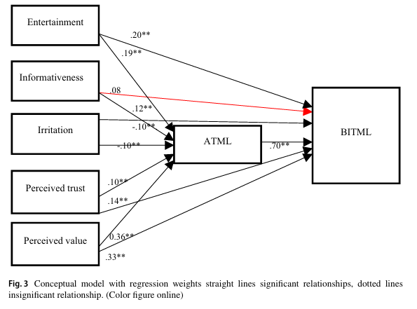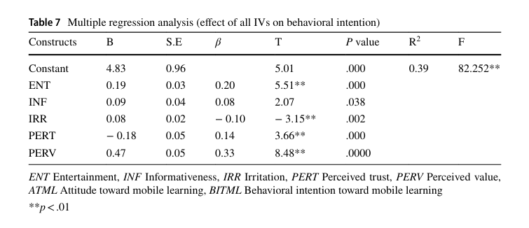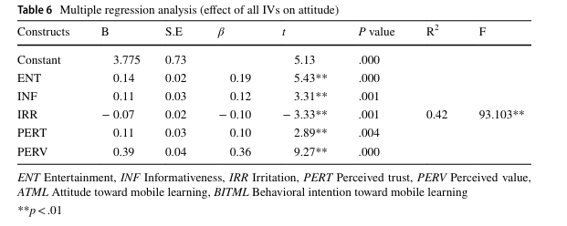 Linear relationships among variables were measured via multiple regression analysis. Hypotheses 1, 2, 4, and 5 state ENT, INF, PERT, and PERV has a significant and positive relationship with attitude, whereas H3 states irritation has a negative relationship with attitude. When ENT is increased by one unit, ATML increases by 0.19 units, as seen in Table 6. ATML will increase by 0.12 units if INF is increased by one unit. ATML will drop by − 0.10 units if IRR is increased by one unit. ATML