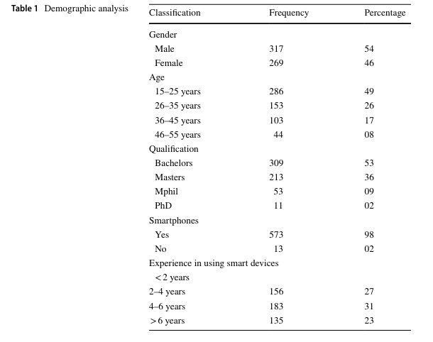 The demographic analysis shows the majority of the respondents are male and in the age category of 15 to 25 years with bachelors in the context of education. Approximately all respondents have smartphones and experience of using smartphones of 4 to 6 years can be seen in Table 1.