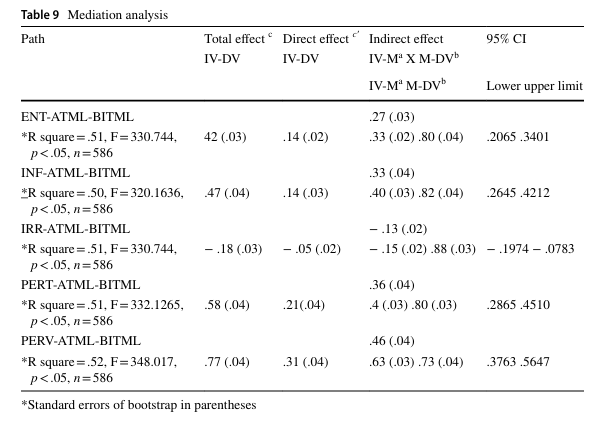 To determine the mediating effect of ATML between ENT and BITML, a path analysis was performed. Table 9 shows that the total impact (0.42, p < 0.05) and indirect effect (0.27, p < 0.05) are both significant (based on 5000-bootstrapped