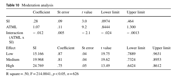 H17 Social influence moderates the relationship between attitude toward mobile learning (ATML) and behavioral intentions toward mobile learning (BITML) in such a way that the relationship is strengthened when social influence is high.