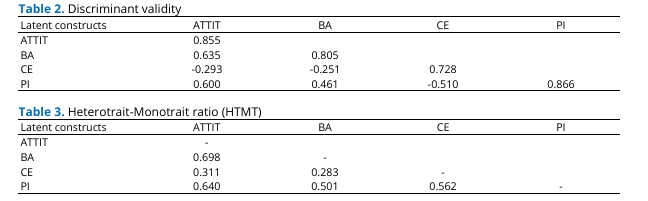Reliability and convergent validity in the present study were confirmed by Cronbach’s Alpha, composite reliability, and average variance extracted (AVE). According to the results reported in Table 1, all item factor loadings exceeded the minimum threshold of 0.7 (Hadi et al., 2016b; Hair et al., 2014) except CE3 and CE6. Both items have retained as the loading of 0.687 and 0.698 didn’t affect the value of AVE and reliability of the focal construct-celebrity endorsement. Further, the scales used in the study are reliable as the values of Cronbach’s Alpha and composite reliability are above the cutoff level of 0.70 (Hair et al., 2010).