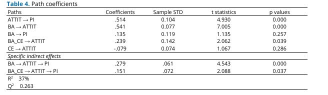 The establishment of discriminant validity is also confirmed by the values of HTMT (see Table 3). All the values are below the threshold of 0.85. Therefore, it is concluded that discriminant validity has been established (Hameed et al., 2022). Thus, we concluded that the latent factors represent distinct constructs. By looking at the analyzed results in Table 4 all the key hypothesized relationships show acceptable fit (R2 = 37%, Q2 = .263). Further, the relationship between Brand awareness and Purchase intention after the inclusion of Attitude as a mediator produces a non-significant result (β = 0.135, t= 1.135, p = >0.05), this finding suggests that Attitude mediates the hypothesized relationship. Further, we found that celebrity endorsement strengthens the relationship between Brand awareness and attitude (β = .239, t = 2.062, p = < 0.05), indicating