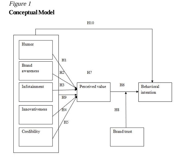 perceived value. The findings of the study described that humor has significant effect on perceived value and behavioral intention. When the ads contain humorous aspect than perception of the customers builds in positive way. Besides, brand awareness, infotainment and credibility of advertising positively influence customer’s perceived value. The information provided to customers should have accuracy, truthfulness and valuable in order to increase the impact of an ad on an individal. The credibility of brand affects the purchase intention of customers. It positively influence purchase intentions via perceived quality and perceived risk (Baek et al. 2010).On the other hand, innovativeness has no significant impact on perceived value. The reason might be respondents are confused about innovative factor that either innovativeness in product/brand Company is offering or innovativeness in designing an ad. Innovativeness is explained as the perception of customers regarding novelty, creativity and uniqueness. The customer’s experiences and emotions must be taking into account in explaining perception (Kunz et al. 2011). So it can be the reason that’s why they are not confirmed and gave their opinion in neutral form. Besides, innovativeness in the advertisements does not have significant impact on behavioral intention rather advertisement should emphasize on the features of the product. The product should hold innovative aspects for high perceived value.