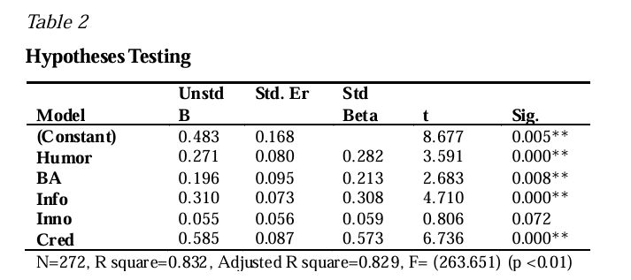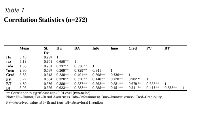 48 items are distributed amongst the target variables of study. 5 items for humor is developed on the basis of extensive literature review. 5 items of brand awareness is adapted from Aaker (1991); Srull (1984). 5 items of infotainment is adapted from Ducoffe’s (1996). 9 items of innovativeness is adapted from Smith et al. (2007). 6 items of credibility is adapted from Hanzaee & Taghipourian, (2012). 5 items of perceived value is adapted from Choi et al. (2004); Sengupta & Johar (2002). 7 items of brand trust is adapted from Morgan & Hunt, (1994). 6 items of behavioral intention is adapted from Zeithaml et al. (1996); Sengupta & Johar, (2002).Systematic sampling technique is executed  to draw sample from four universities of twin cities Rawalpindi and Islamabad and sample size was 272 individuals. Students were opted to measure the impact of advertising on behavioral intentions because  they are more inclined towards using cellular services and watching advertisements of Telecom companies. Total 400 questionnaires distributed in order to get enough number of responses and to run analysis. 272 questionnaires were received back in time span of two  months and response rate of the study was 68%. Multiple Regression Analysis is conducted and Barron and Kenny’s (1986) method is used  to measure moderation and mediation effect.