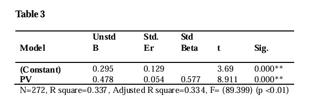To check hypothesis H6, perceived value is regressed on behavioral intention. The results showed that R square value is0.337,it means 34% variation in behavioral intention variable is explained by predictor. The hypothesis is accepted because beta coefficient t value is 8.911 which is highly significant.