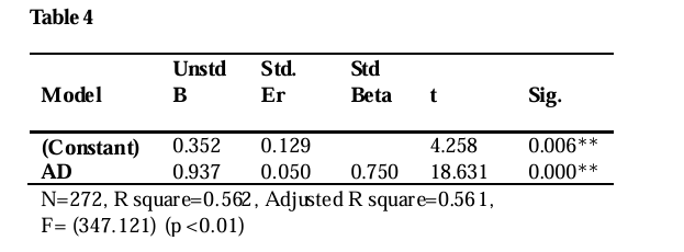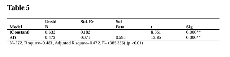 The results showed that R square value is 0.483, means 48% variation in customer’s behavioral intention variable is explained by independent variable. The hypothesis is accepted because beta coefficient t value is 12.85 which is highly significant and states that advertising dimensions has significant impact on behavioral intention, therefore accepts H10.