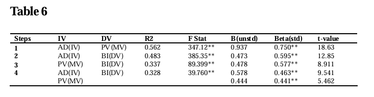 step indicates that model is significant because of beta coefficient t value=18.63, R square=0.562 and standardized beta coefficient 0.750. The R square value described that 56% variation in criterion is caused by predictor and standardized beta coefficient value explains that 75% contribution in explaining the relationship. For second mediation step, beta coefficient t-value=12.85, R square=0.483 and standardized beta coefficient 0.595. The R square value described that 48% variation in criterion is caused by predictor and standardized beta coefficient value explains that 59% contribution in explaining the relationship. As far as third step of mediation is concerned, beta coefficient t value=8.911, R square=0.337 and standardized beta coefficient 0.577. The R square value described that 34% variation in criterion is caused by predictor and standardized beta coefficient value explains that 57% contribution in explaining the relationship. Lastly, the beta coefficient t-value of advertising dimensions with behavioral intention is significant that is 9.541 and beta coefficient t value of perceived value with behavioral intention is 5.462. This clearly illustrate that mediation exist but partial mediation because t value of advertising dimensions with behavioral intention is significant and greater than t-value of perceived value and behavioral intention. Thus, direct effect is more significant as compared to indirect effect, however partial mediation exists. Hence accepts H7.