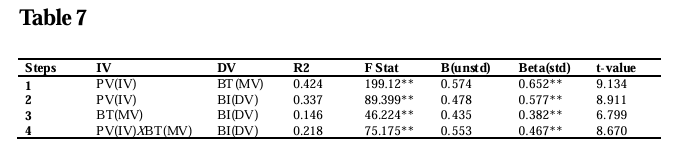 In order to check moderation, Baron’s and Kenny’s (1986) four steps are applied. Before performing moderation analysis, Barron’s and Kenny’s assumptions must be fulfilled that is significant relationship between IV-DV, IV-MV and MV-DV (first three steps). In this case assumptions are fulfilled and moderation analysis runs by entering IV and MV product (Interaction term) as independent variable. Step 4 in Table 7 shows significant relationship, thus explains that moderation exist between perceived value and behavioral intention. The value of R square and Beta for Interaction term is small t = 8.670, R square = 0.218 as compared to direct relationship between perceived value and behavioral intention t = 8.911, R square = 0.337, thus shows weak moderation exist hence accepts H8. So, future research is recommended to check the impact of moderator on dependent variable.