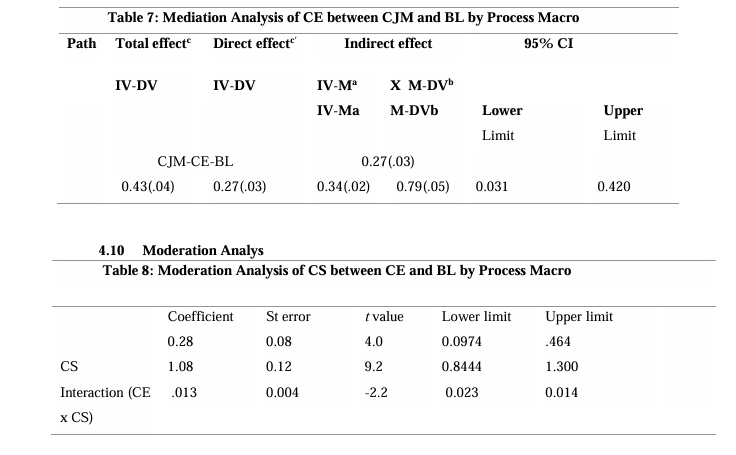 A path analysis was conducted to test the mediating effect of CE between CJM and BL. Results shown in Table are based upon 5000 bootstrapped samples indicating that total effect (.43, p<.05) and indirect effect (.27, p<.05) is significant. The results indicate that CE mediates the relationship between CJM and BL (lower 95% CI = .031 and upper 95% CI= .420). The direct effect (.27, p<.05) is also significant thus, shows partial mediation exists (Chang et al., 2013).