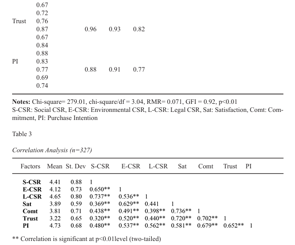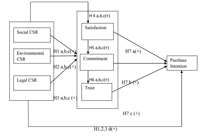 of satisfaction, commitment and trust. H 1, 2, 3 a, b, c, d: There is a positive relationship between social CSR, environmental CSR and legal CSR with satisfaction, commitment, trust and purchase intention.