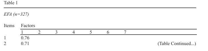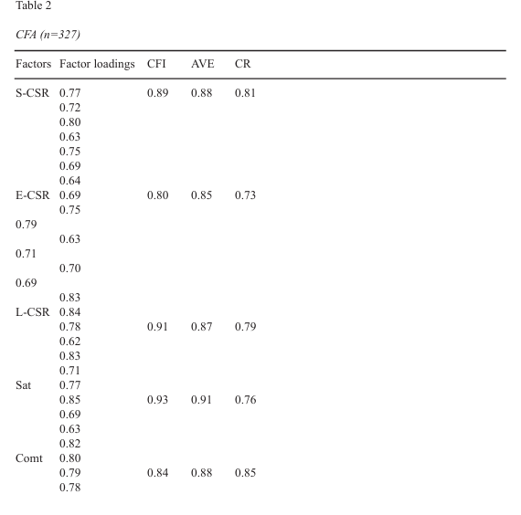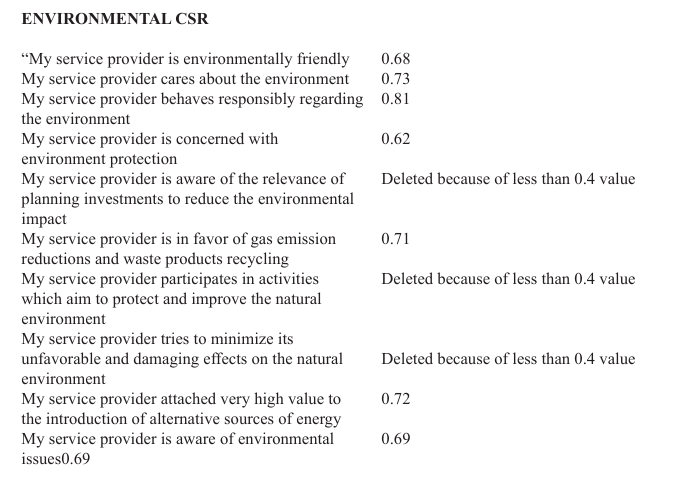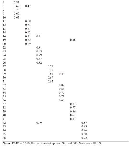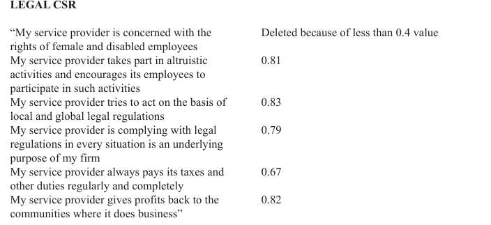 EFA is accomplished via SPSS-21. KMO and Bartlett’s test measures sampling adequacy and value is 0.760 (Kaiser, 1974). The Bartlett’s test value is significant at p = 0.000 and less than 0.05 (Bartlett, 1954), therefore, factor analysis is suitable. Entirely 7 items were removed from the study, 3 from social CSR and environmental CSR each and 1 from legal CSR construct and factor loadings indicated 82.1% variance. The items with factor loading less than 0.40 were removed from the analysis. Since, seven factors were requested, based on the fact that the items were designed to index seven constructs and results elucidate that the study retained 39 items for further analysis.