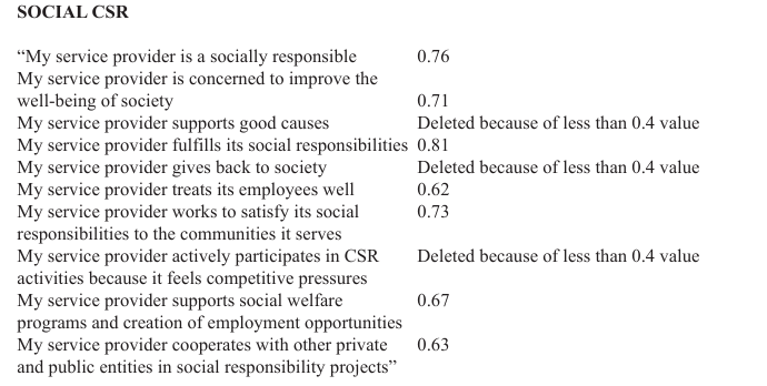 The instrument was adapted and the questions regarding demographics and variables of interest were split into two parts. Ten items of social CSR and environmental CSR each and six of legal CSR was adapted from Du et al. (2007), Curras-Perez et al. (2009), Hanzaee and Rahpeima, (2013), Vazquez et al. (2011) and Kim et al. (2010). Five items of satisfaction, commitment, trust and purchase intention each were adapted from Cronin et al. (2000), Kimpakorn and Tocquer (2009), Sirdeshmukh et al. (2002) and Pavlou (2003). There were a total 46 items and 5 points Likert scale was used which had options from strongly disagree to strongly agree. Faculty of various universities of the twin cities of Rawalpindi & Islamabad) was taken as a population. Out of 19 universities 03 universities were selected which includes: Quaid-e-Azam University, Federal Urdu University, and Virtual University of Pakistan. Convenience sampling technique was used to collect data and faculty members were opted because they are more knowledgeable regarding CSR activities and the dimensions of CSR includes social, environmental and legal CSR and they were needed to think before filling the questionnaire weather the telecom service provider they were using was practicing CSR and specifically which dimension of CSR. The telecom sector was taken as a whole to evaluate the concept of CSR because it’s a growing phenomenon in Pakistan and they are practicing CSR activities. It includes all five telecom companies providing its facilities in Pakistan that include: Ufone, Warid, Zong, Mobilink, and Telenor. Operators of Telecom sector are indulged in CSR activities and the following activities are observed: Flood relief, Citizen Foundation, Tabeer transport service for women, SOS Iftar, Training in schools and Breast cancer awareness sessions, donating cash to education and health sector and they are donating money on regular basis. They are also donating to environmental pollution prevention causes and are doing cause-related marketing via SMS and