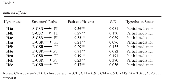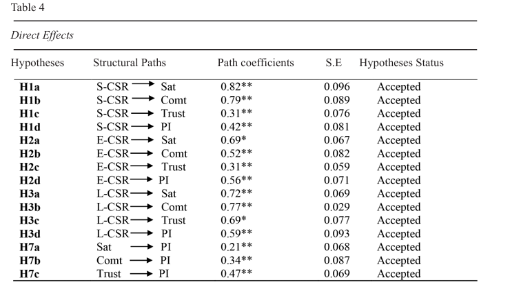 The structural model is developed to test the hypotheses. The path estimates of H1a, b, c, d showed significant direct relationship between variables (0.82**, 0.79**, 0.31**, 0.42** p<0.01) thus, supports H1a, b, c, d. The path estimates of H2 a, b, c, d showed significant relationship between the variables (0.69* (p<0.05) 0.52**, 0.31**, 0.56** p<0.01) thus supports H2 a, b, c, d. The path estimates of H3 a, b, c, d showed positive significant relationship (0.72**, 0.77** (p<0.01), 0.69* (p<0.05), 0.59** (p<0.01) therefore accepts H3 a, b, c, d. H4 a, b, c the path leading from social, environmental and legal CSR to purchase intention, there is one direct effect and one indirect effect. The estimated direct effect of social, environmental and legal CSR on satisfaction (0.82**, 0.69*, 0.72**) and satisfaction on purchase intention is significant (0.21**). Correspondingly, indirect impact of social CSR, environmental CSR and legal CSR on purchase intention via satisfaction is also significant (0.36**, 0.21**, 0.19**). Since the outcome meet the necessary condition of validating mediating impact of satisfaction (Plewa et al., 2014; Hsu, 2012; Luo & Bhattacharya, 2006). The beta value of direct impact is greater as compared to indirect impact thus shows partial mediation exist therefore accepts H4 a, b, c. Similarly, for H5 a, b, c the estimated direct effect of social, environmental and legal CSR on commitment (0.79**, 0.52**, 0.77**) and commitment on purchase intention is