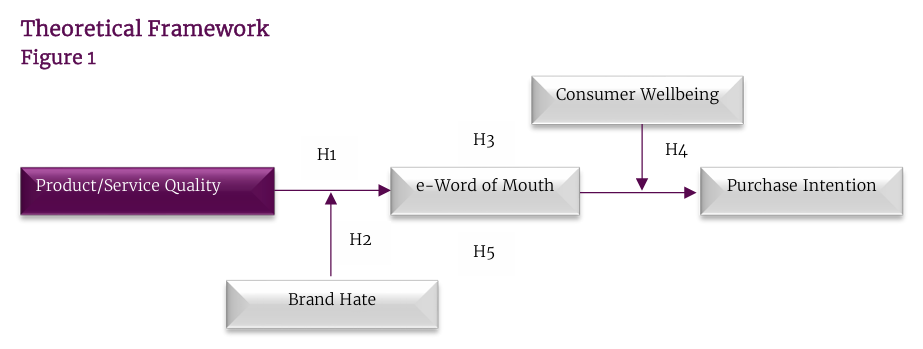 In summary, the framework aligns with ECT by demonstrating how initial product/service quality influences consumer expectations and subsequent behaviors (e-Word of Mouth, Brand Hate, Consumer Wellbeing, and Purchase Intention) through the confirmation or disconfirmation of these expectations.