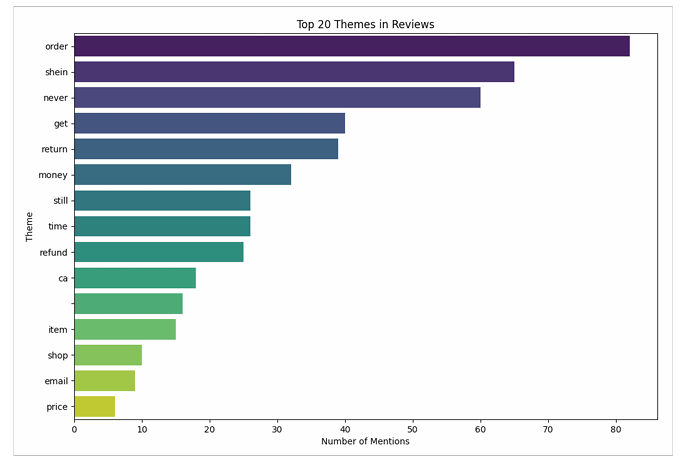 The top 20 themes included words like ‘order’, ‘custom’, ‘shein’, ‘item’, ‘servic’, ‘return’, ‘receiv’, ‘never’, ‘cloth’, ‘refund’, ‘get’, ‘tri’, ‘still’, ‘packag’, ‘time’, ‘shop’, ‘money’, ‘ca’, ’email’, and ‘price’.